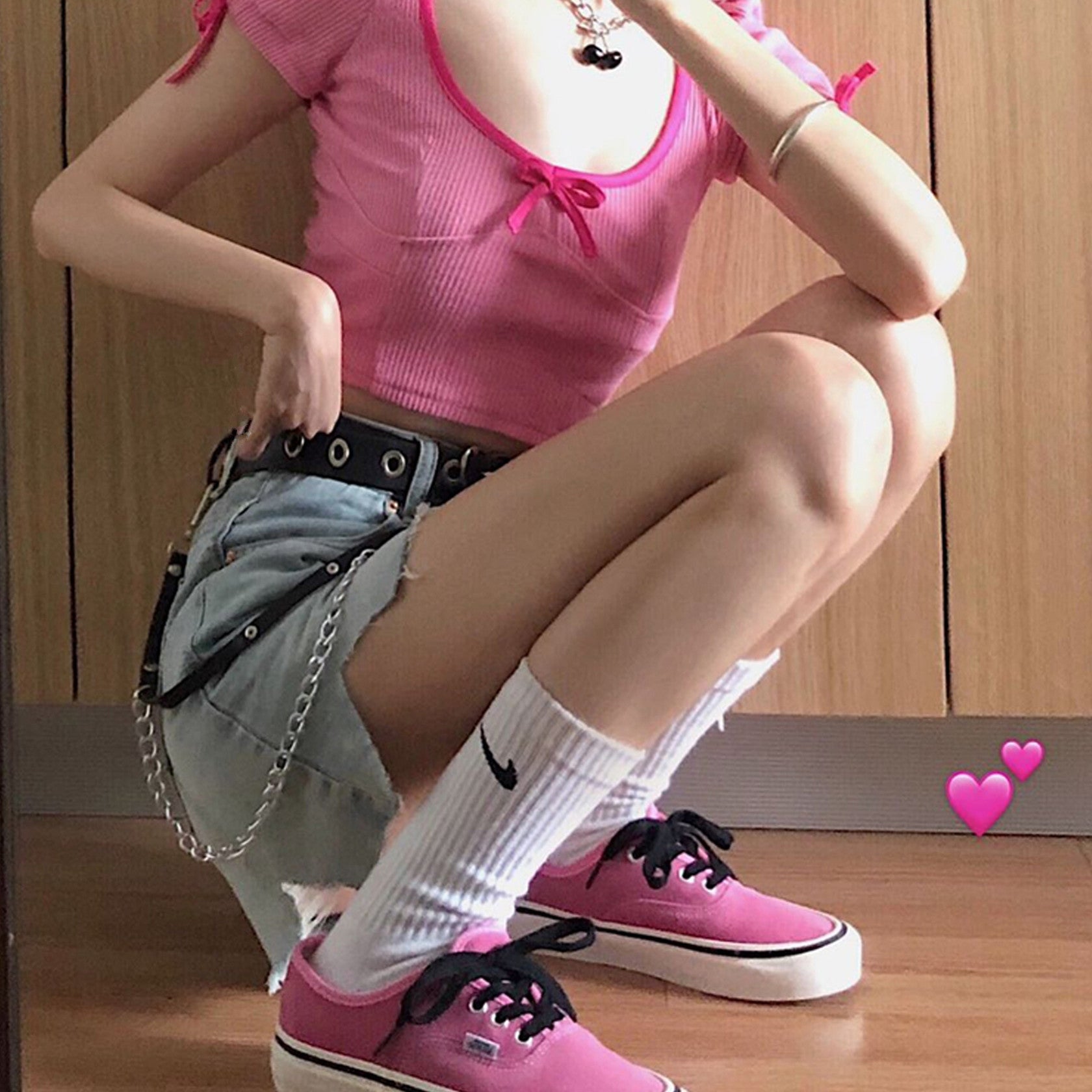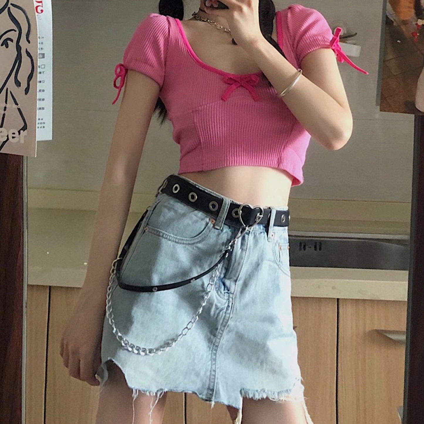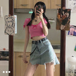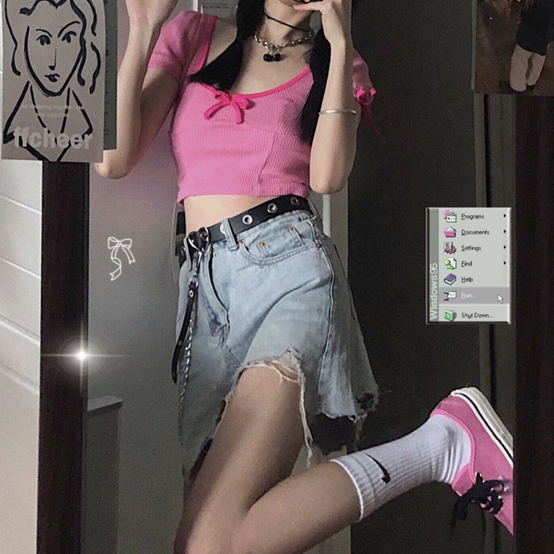 Sweetheart pink T-shirt and retro denim skirt SS2307